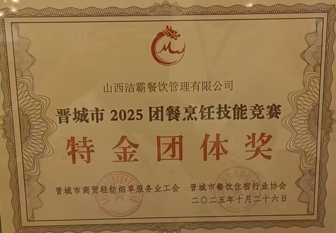 10月26日,由晉城市總工會(huì)、晉城市商務(wù)局、晉城市人力資源和社會(huì)保障局主辦,晉城市商貿(mào)輕紡煙草服務(wù)業(yè)工會(huì)委員會(huì)、晉城市餐飲住宿行業(yè)協(xié)會(huì)承辦的“情系職工 美好食光”晉城市2025團(tuán)餐烹飪技能競(jìng)賽在高都大酒店圓滿落幕,山西潔霸餐飲管理有限公司斬獲“特金團(tuán)體獎(jiǎng)”。